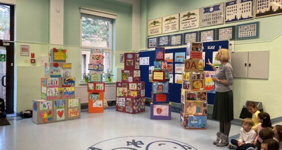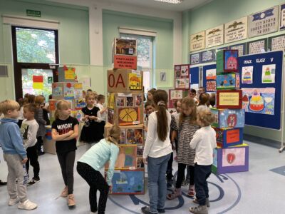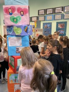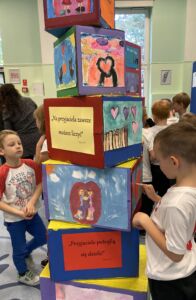 Tematem obrony projektów klas 0-3 brzmiał: Przyjaźń, niejedno ma imię…. Każda z klas przygotowała przestrzenną instalację, na której to umieściła prace plastyczne, zdjęcia ze wspólnych wycieczek i hasła dotyczące przyjaźni. Prezentacje wywołały dużo radości i pozytywnych emocji.