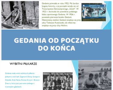 Zaprezentowali różne formy swoich wystąpień – prezentacje multimedialne, filmy, gry planszowe, quizy. Przedstawili projekty związane z historią lotniska na Zaspie, gdańskim browarem, Ginterze Grassie, Ludwiku Waryńskim – patronie naszej ulicy. Dzięki prezentacjom poznaliśmy historię klubu sportowego „Gedania” , dawnego budynku PSS Społem, w którym teraz mieści się nasza szkoła. Odbyliśmy wirtualną wycieczkę po wrzeszczańskich parkach i skwerach oraz wzdłuż rzeki Strzyża.