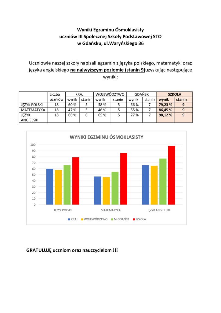 Wyniki Egzaminu Ósmoklasisty uczniów III Społecznej Szkoły Podstawowej STO