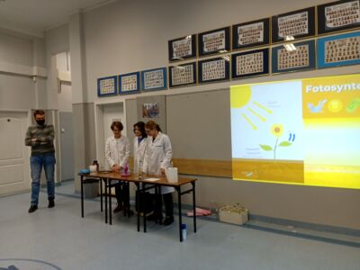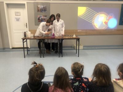 Uczennice klasy 8 przeprowadziły doświadczenia otrzymywania dwutlenku węgla oraz zaprezentowały metody jego identyfikacji. To właśnie nadmiar tego gazu w atmosferze przyczynia się do zmian klimatycznych – efektu cieplarnianego. Uczniowie klasy 7 przedstawili negatywne skutki efektu cieplarnianego obserwowane w różnych częściach świata.